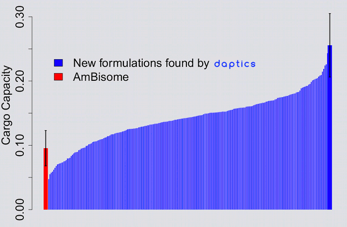AmBisome™ is the leading formulation of Amphotericin B, an anti-fungal drug. daptics was applied to find novel formulations of the drug, optimized for cargo capacity.