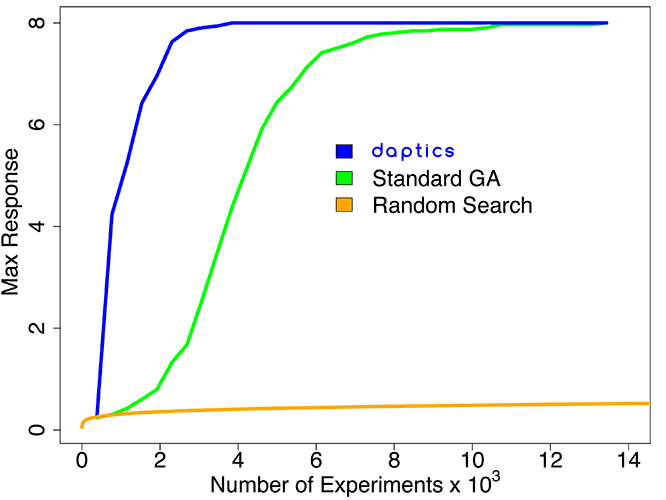 daptics found all of the optimal targets in this space after exploring only 4,000 experiments, and was over 3 times more efficient than a standard GA.